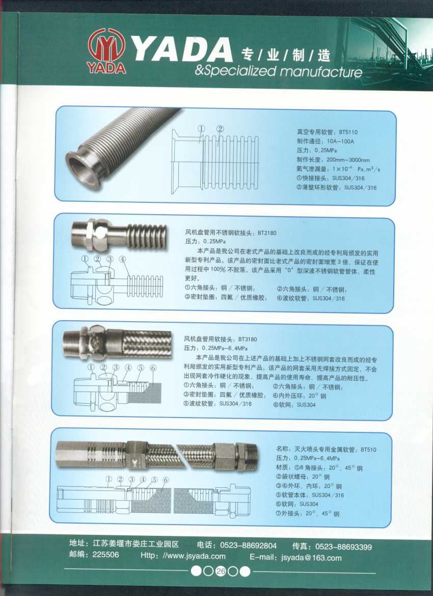 秉天時(shí) 籍地利 仰人和 虔誠(chéng)一個(gè)永恒的理念,創(chuàng)新永續(xù).百諾不如一信,亞達(dá)人堅(jiān)持以信為本,視客戶如同上帝,把對(duì)信譽(yù)的追求,體現(xiàn)在嚴(yán)格的質(zhì)量控制和完善的客戶服務(wù)上,讓客戶百分之百滿意是亞達(dá)人不變的信念。 本廠系ISO9001質(zhì)量認(rèn)證企業(yè)、計(jì)量合格企業(yè)。本廠專業(yè)致力于生產(chǎn)不銹鋼金屬波紋軟管、超高壓、高壓膠管、波紋管補(bǔ)償器(膨脹節(jié))、立式、臥式、冷卻器。本廠產(chǎn)品具有承受壓力高、彎曲半徑小、抗疲勞性能強(qiáng)、使用壽命長(zhǎng)等特點(diǎn)。廣泛應(yīng)用于電力、石化、冶金、水泥建材、工程機(jī)械、礦山及液壓系統(tǒng)。產(chǎn)品暢銷全國(guó)各地。 今日亞達(dá)之成功源自諸多客戶的厚愛(ài),明天的輝煌更離不開(kāi)您對(duì)我的支持與信賴。查看更多>>